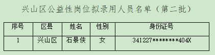 根据兴山区人力资源和社会保障局公益性岗位公开招聘工作方案及相关规定,经过报名、资格审查、体检等环节,现对拟录用人员名单予以公示。